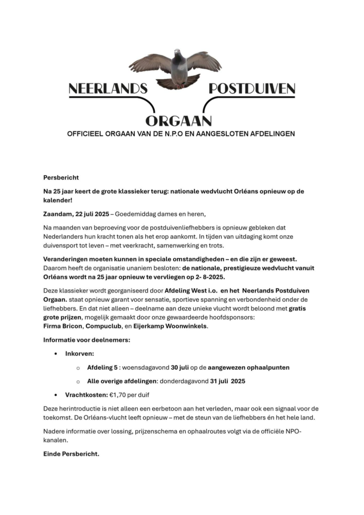 Info reserve dagfond vlucht28 juli 2025Mettet wordt Hirson4 augustus 2025 Nationale wedvlucht Orleans opnieuw op de kalender Zie deze link: https://www.duivensportbond.nl/artikel/Orleans-2025 en de info beneden: Share Douwe Gerelateerd30 september 2025Afdeling Oost – Nieuwsbrief #2Meer lezen Comments are closed.