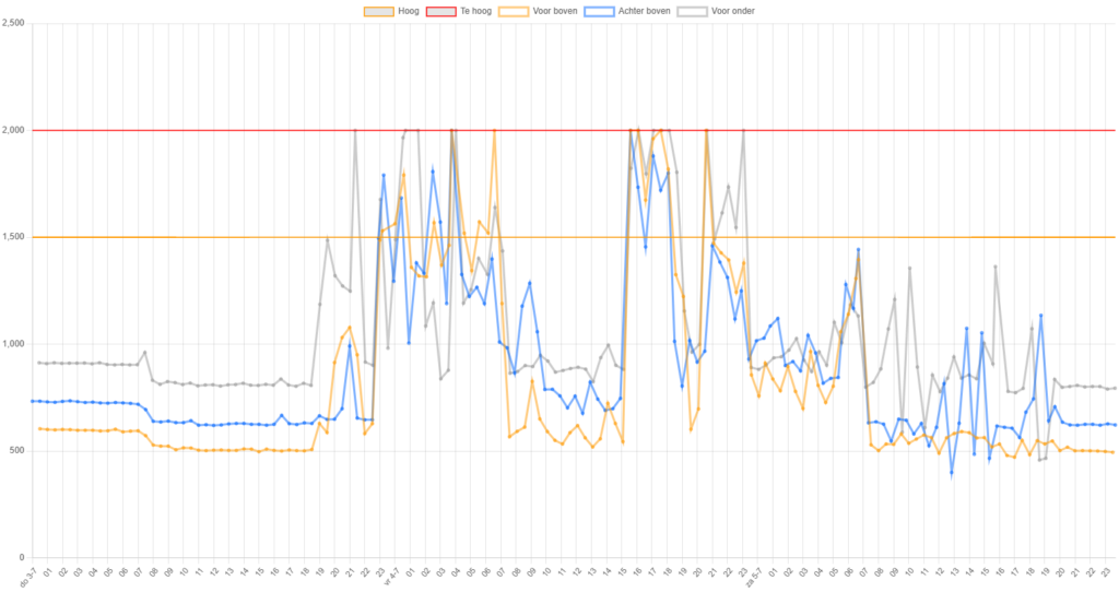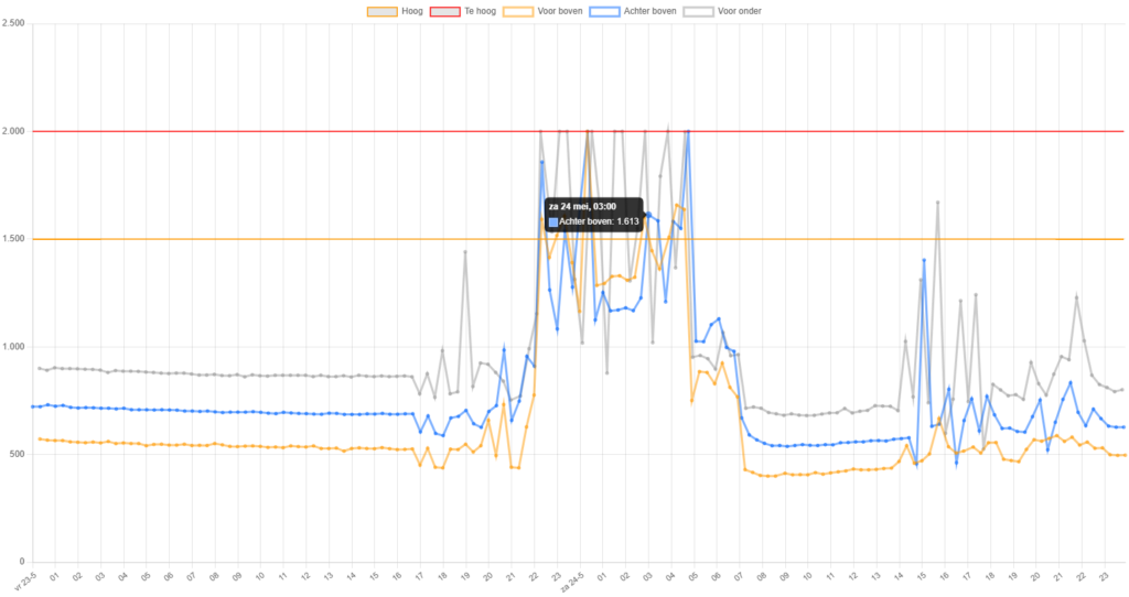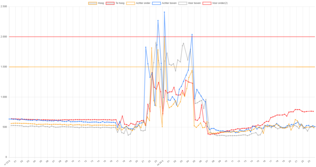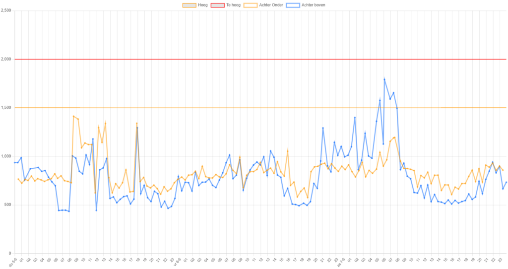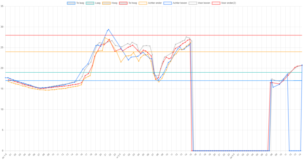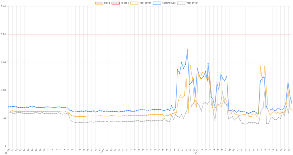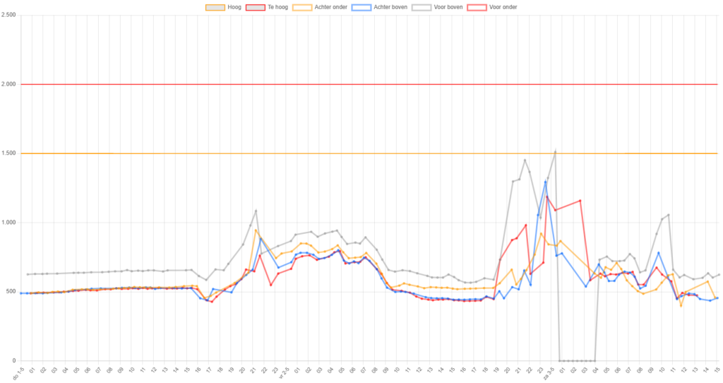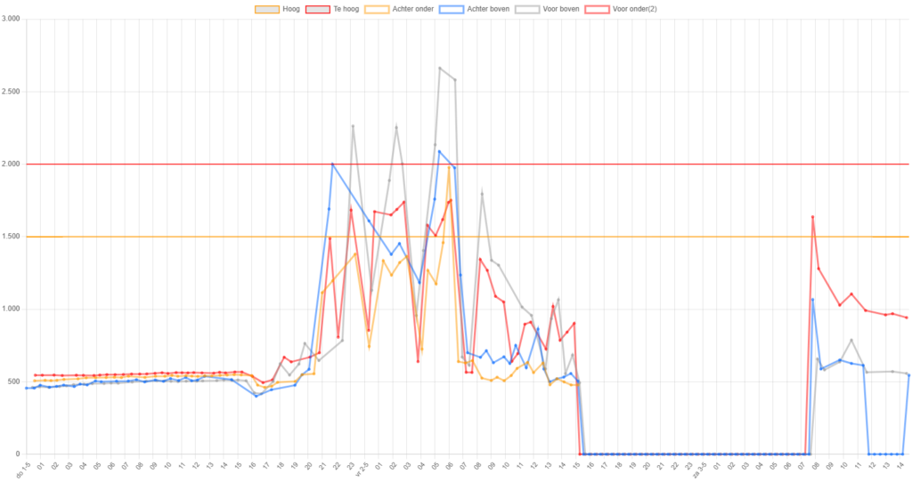 BIj container 6 is de accu van de container leeggeraakt omdat de truck een probleem had in de stroomtoevoer. De truck is rond half 2 gewisseld, vanaf toen waren de metingen weer online. Je ziet bij elke container naar Den Bosch een kleine piek rond half 2 omdat de containers stil hebben gestaan op zoek naar een geschikte plek die waterpas was, dus minder ventilatie.