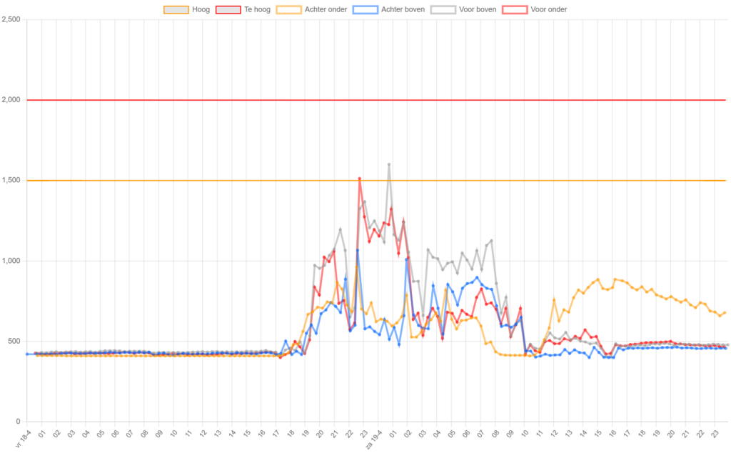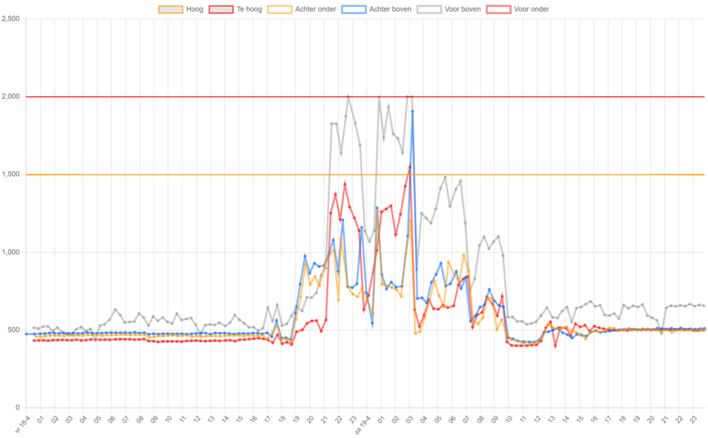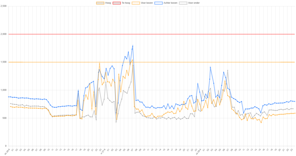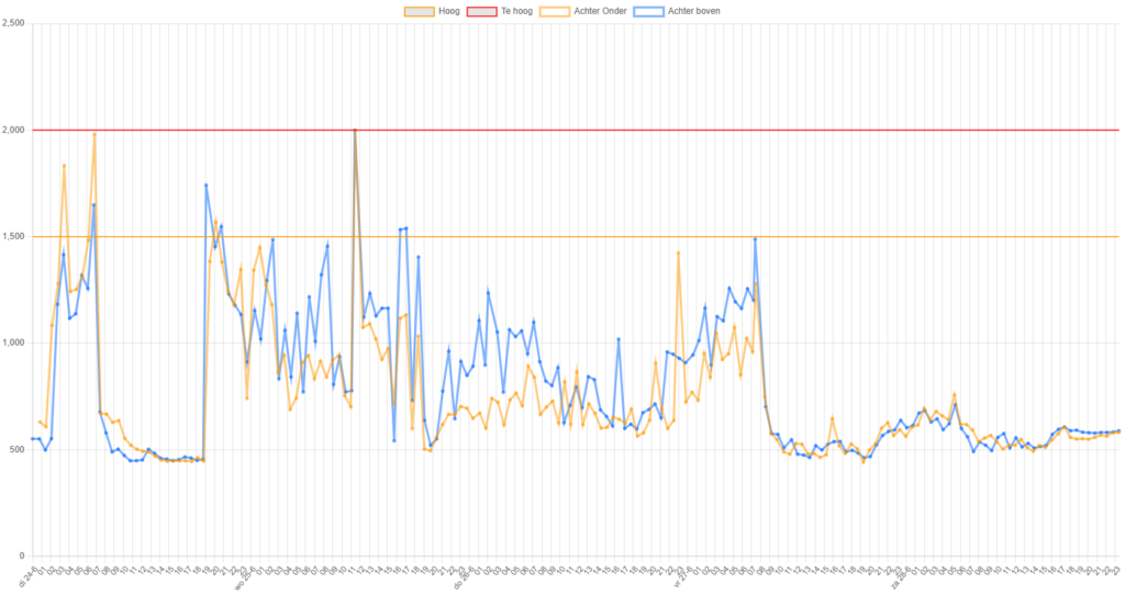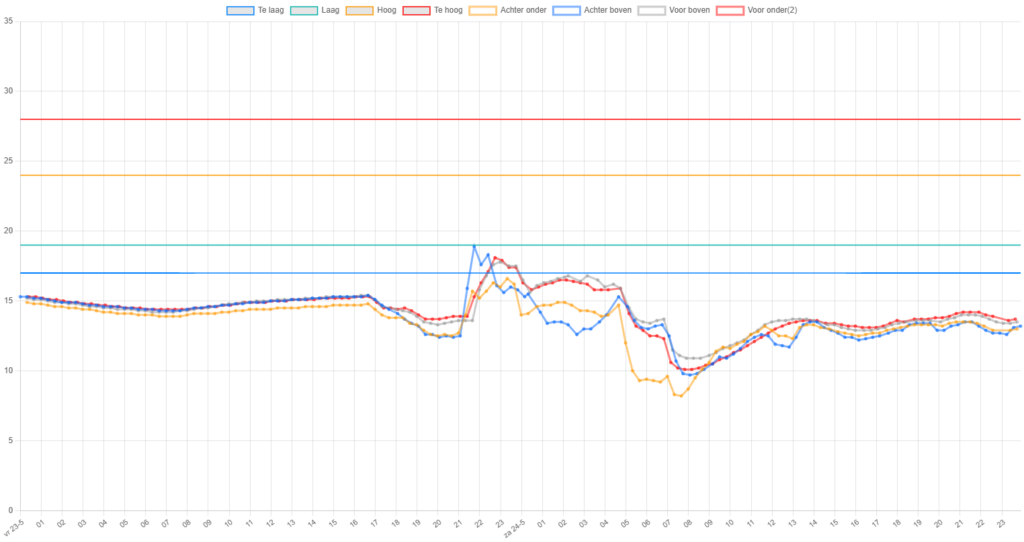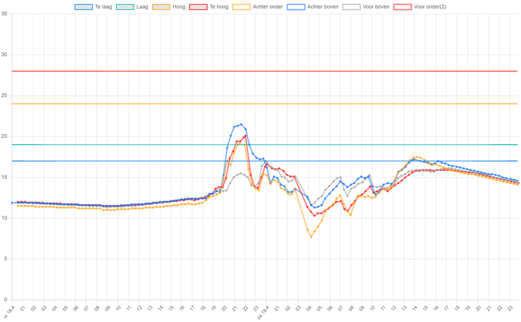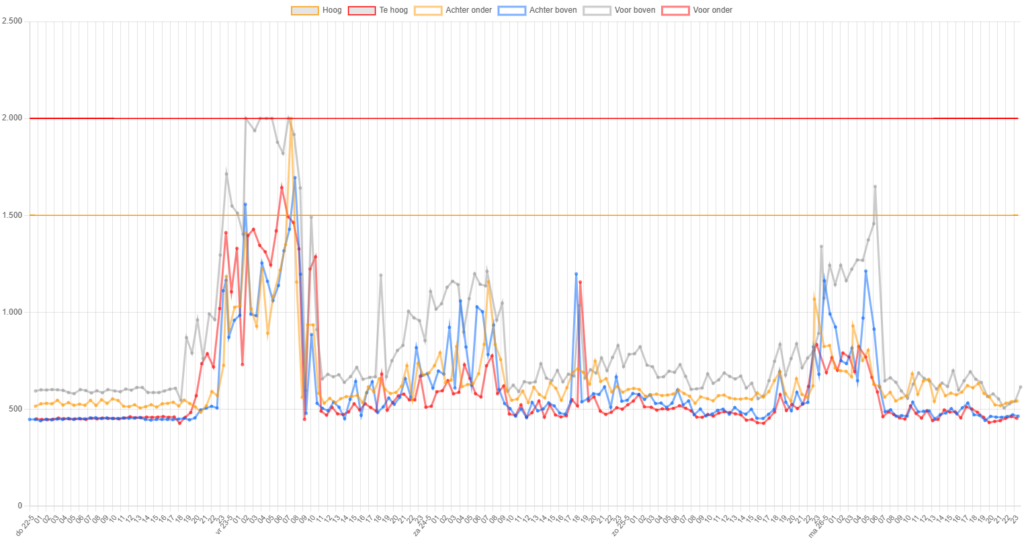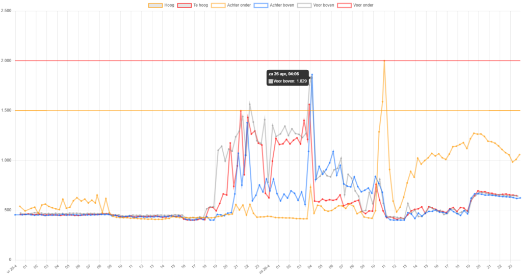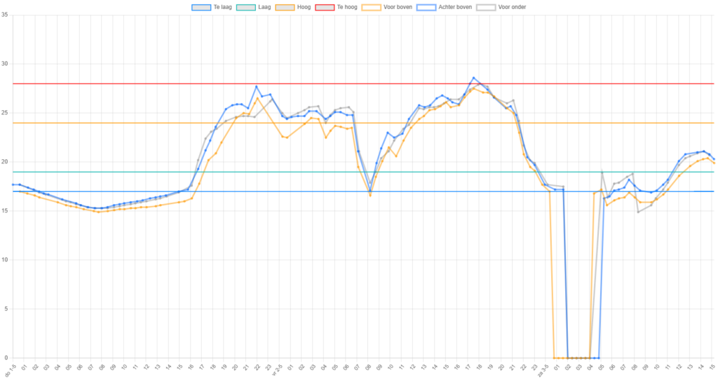 BIj container 6 is de accu van de container leeggeraakt omdat de truck een probleem had in de stroomtoevoer. De truck is rond half 2 gewisseld, vanaf toen waren de metingen weer online. Je ziet bij elke container naar Den Bosch een kleine piek rond half 2 omdat de containers stil hebben gestaan op zoek naar een geschikte plek die waterpas was, dus minder ventilatie.
