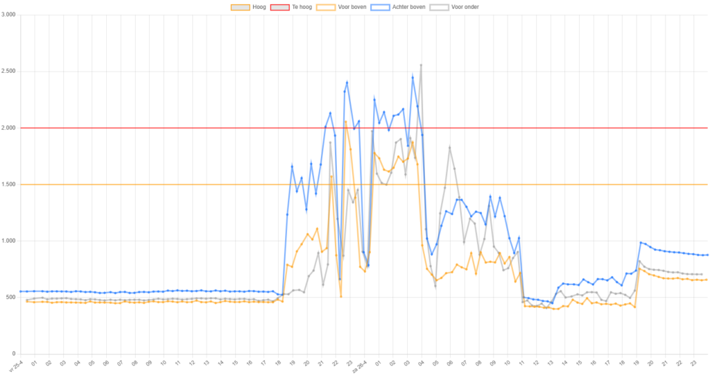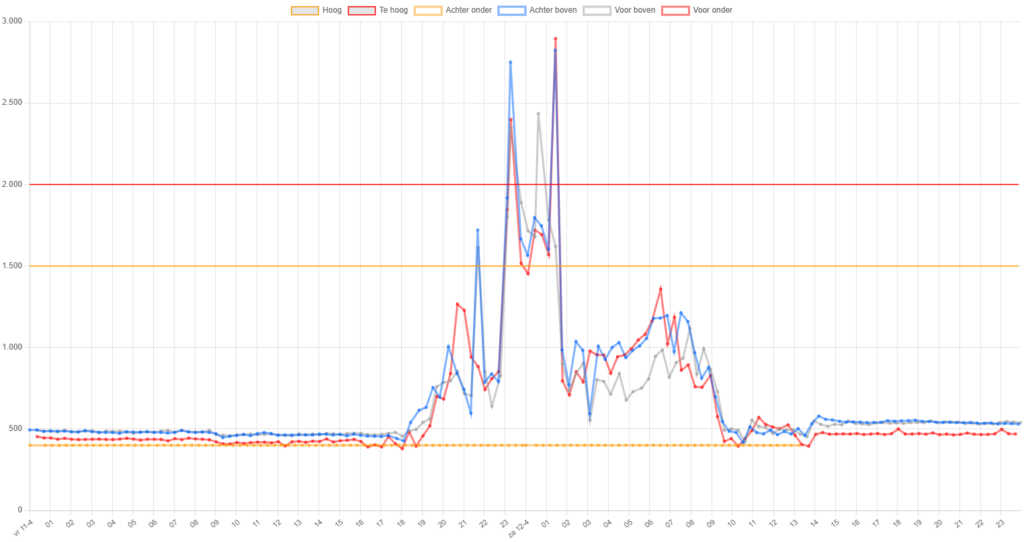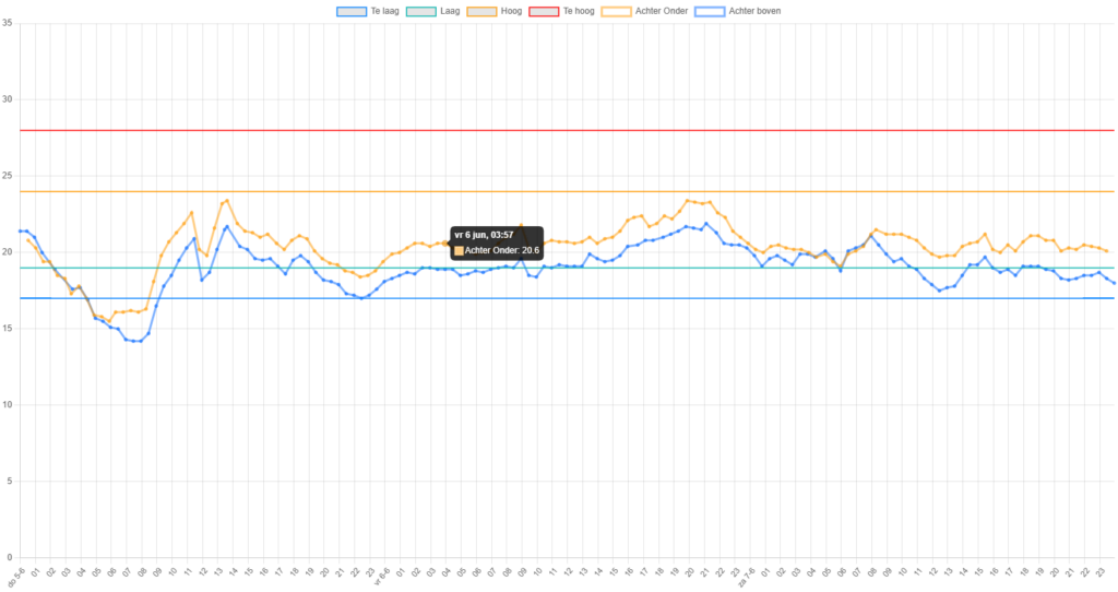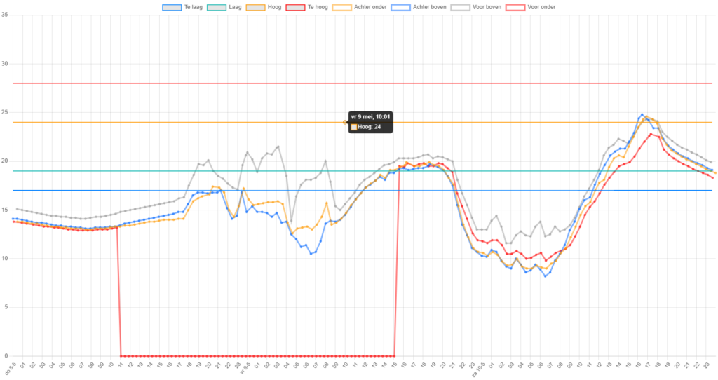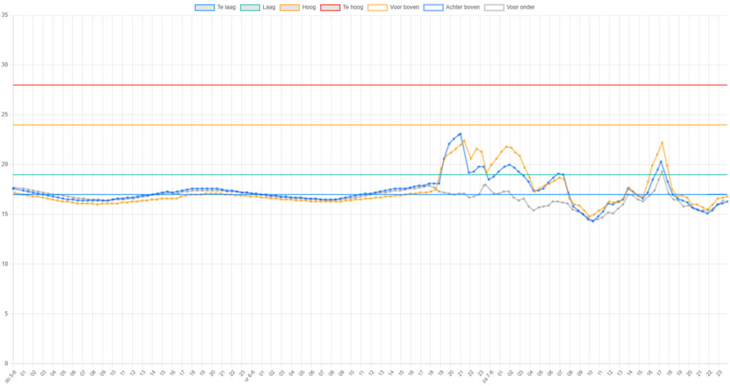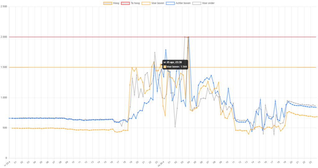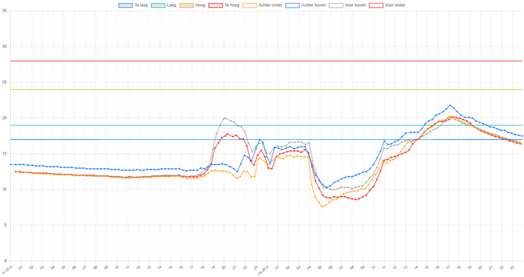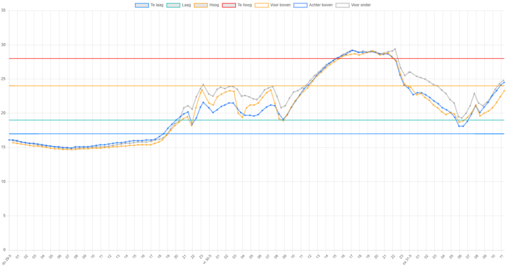 BIj container 6 is de accu van de container leeggeraakt omdat de truck een probleem had in de stroomtoevoer. De truck is rond half 2 gewisseld, vanaf toen waren de metingen weer online. Je ziet bij elke container naar Den Bosch een kleine piek rond half 2 omdat de containers stil hebben gestaan op zoek naar een geschikte plek die waterpas was, dus minder ventilatie.