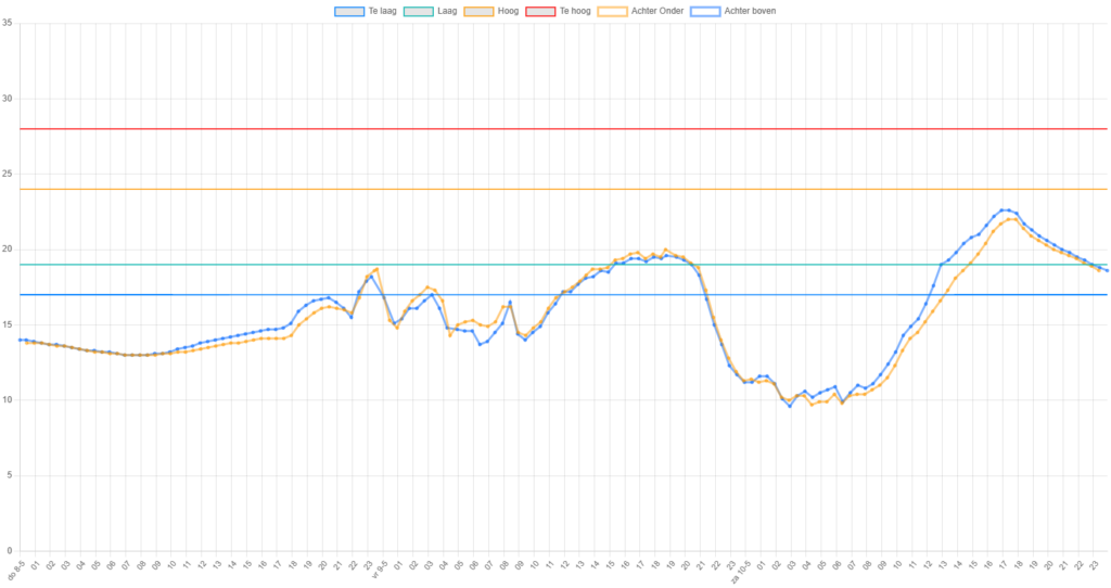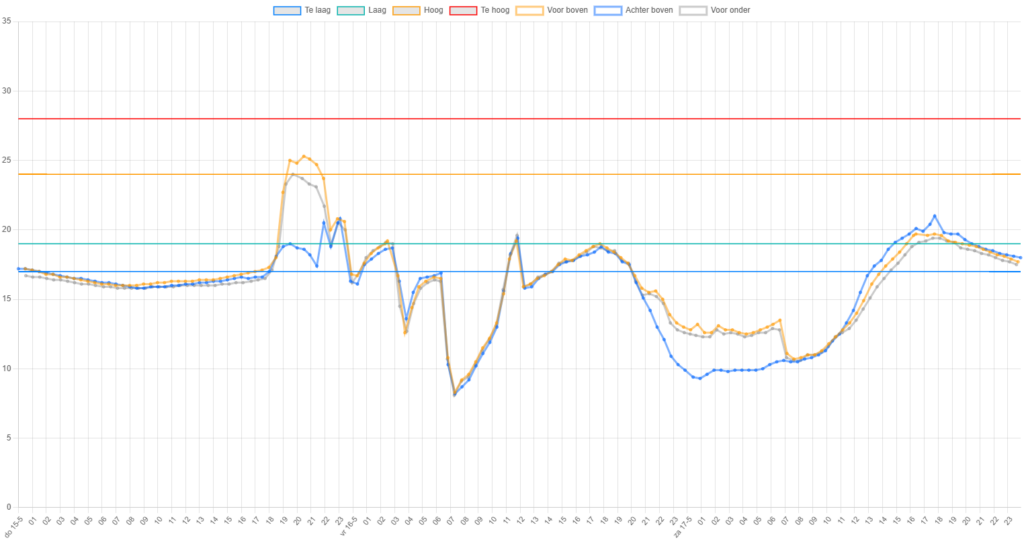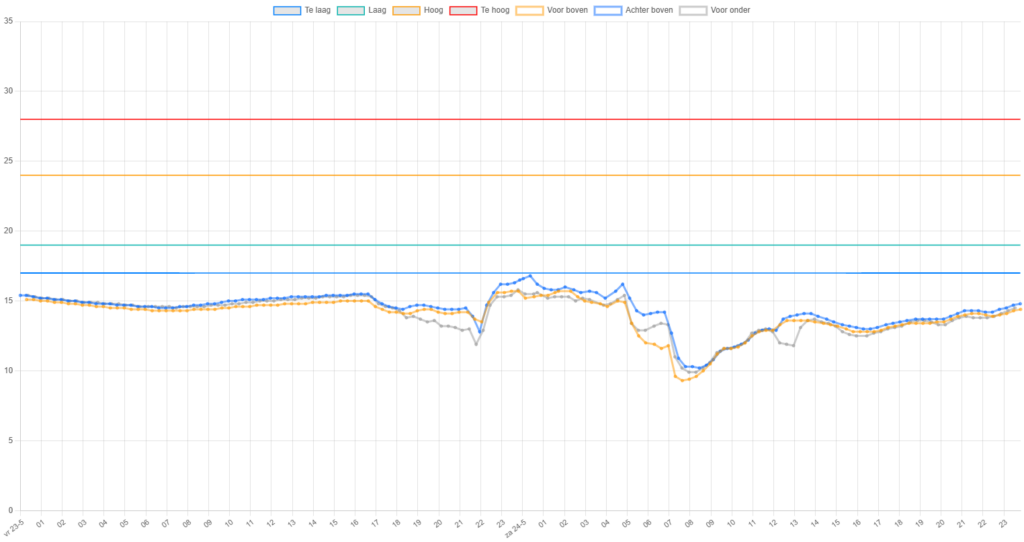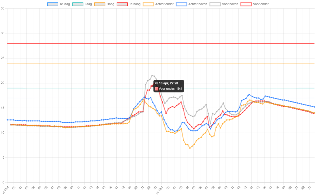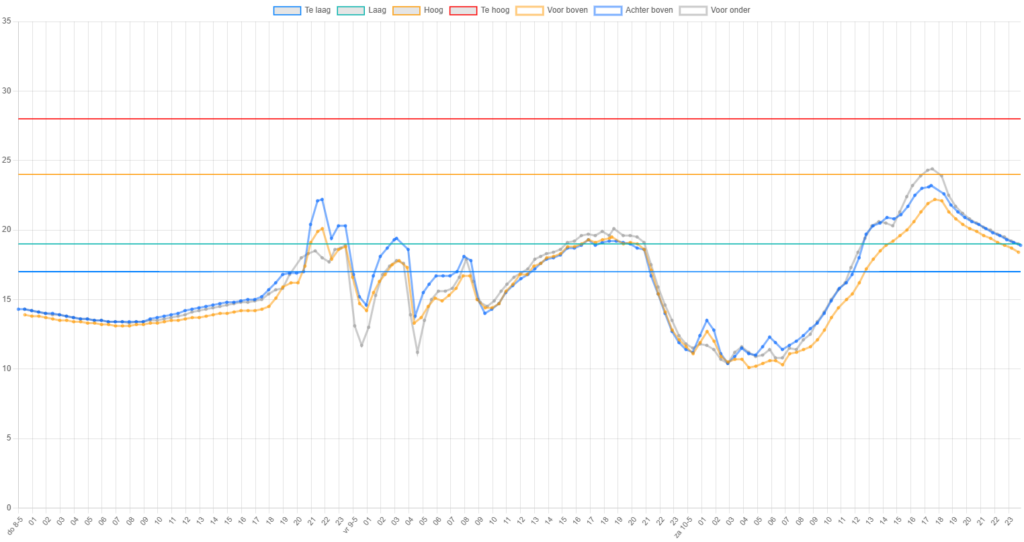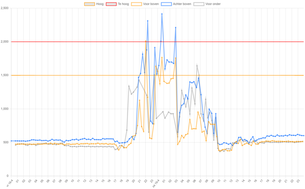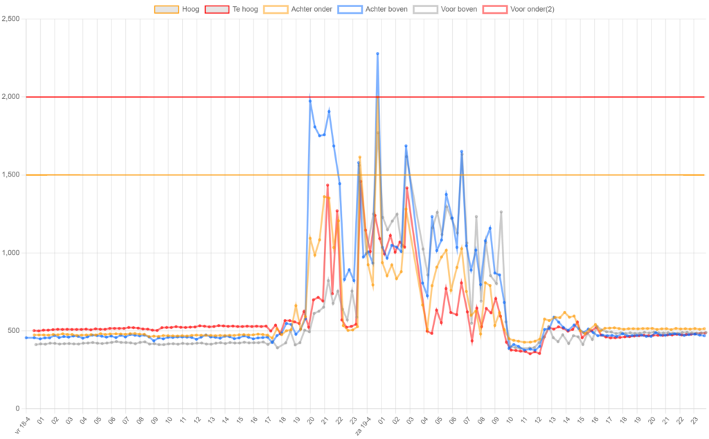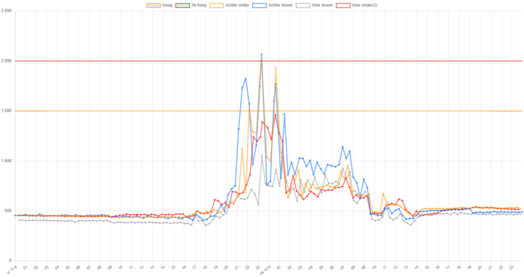 BIj container 6 is de accu van de container leeggeraakt omdat de truck een probleem had in de stroomtoevoer. De truck is rond half 2 gewisseld, vanaf toen waren de metingen weer online. Je ziet bij elke container naar Den Bosch een kleine piek rond half 2 omdat de containers stil hebben gestaan op zoek naar een geschikte plek die waterpas was, dus minder ventilatie.